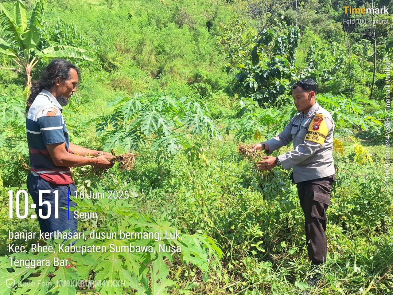 Sumbawa Besar–NTB, Bhabinkamtibmas Desa Luk, BRIGADIR I Komang Widnyana, menunjukkan komitmennya dalam mendukung ketahanan pangan di wilayah binaannya di Desa Luk, Kecamatan Rhee, Kabupaten Sumbawa pada Senin, (16/6/2025) pukul 10.50 WITA, ia turut serta membantu panen kacang tanah di kebun sayuran milik Saudara Kadek Suwandayasa di Desa Luk, Kecamatan Rhee, Kabupaten Sumbawa.