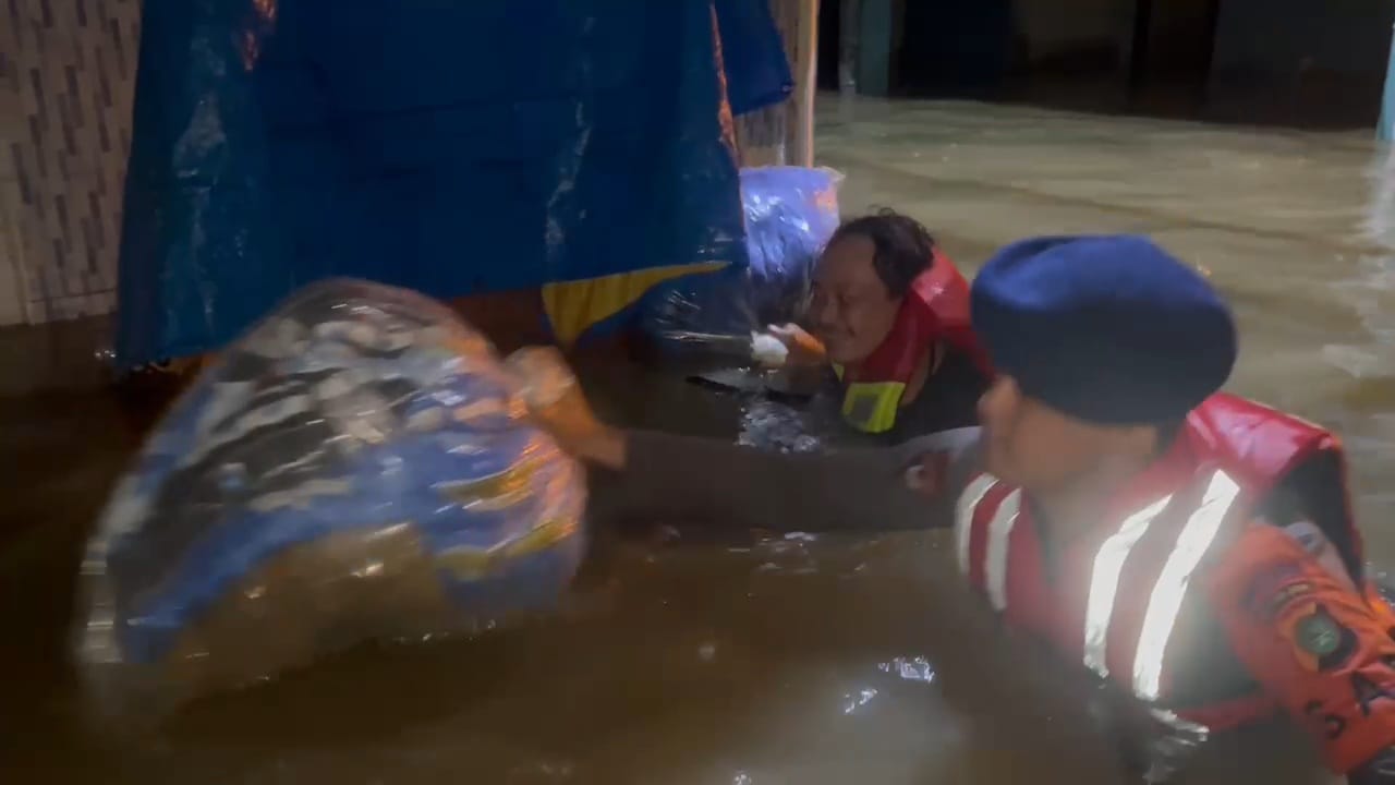 Satuan Brimob Batalyon B Pelopor Polda Metro Jaya bersama TNI membantu mengevakuasi seorang ibu hamil yang akan melahirkan tersebut. Evakuasi dilakukan menggunakan pelampung dari ban.