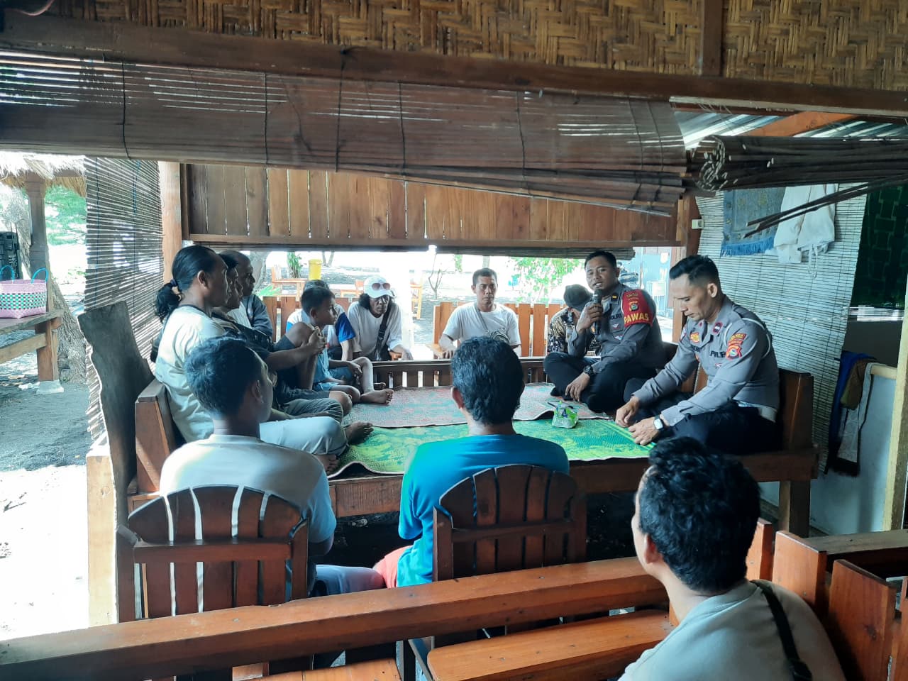 Kegiatan berlangsung dalam suasana akrab dan penuh kebersamaan. Para anggota komunitas ojek tampak antusias mengikuti dialog ringan bersama petugas terkait pentingnya keselamatan berlalu lintas, terutama dalam menjalankan profesi sebagai pengendara ojek pangkalan yang berinteraksi langsung dengan pengguna jalan setiap hari.